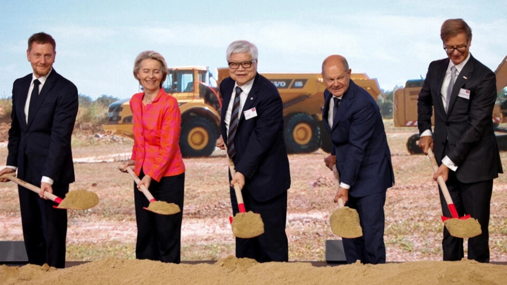 2024年8月20日,德國東部城市德累斯頓,薩克森州州長邁克爾·克雷奇默(Michael Kretschmer)、歐盟主席馮德萊恩、台積電董事長兼首席執行官魏哲家和德國總理朔爾茨出席台灣芯片製造商台積電歐洲首家工廠奠基儀式。REUTERS