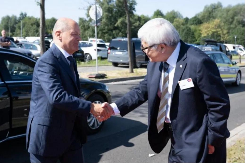 台積電董事長魏哲家在德國廠破土典禮中,迎接德國總理蔌爾茨