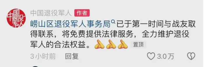8月31日,退役軍人事務部宣傳中心官方抖音賬號,“中國退役軍人”在評論區留言:“嶗山區退役軍人事務局已於第一時間與戰友取得聯繫,將免費提供法律服務,全力維護退役軍人的合法權益。