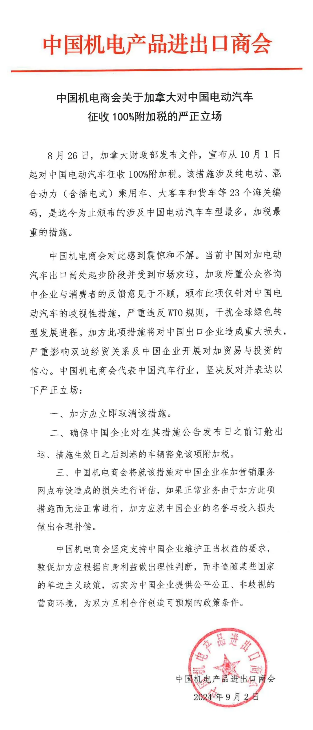 9月2日,“中國機電產品進出口商會”公眾號發佈立場文件稱,中國機電商會針對“加拿大對中國電動汽車徵收100%附加税”一事,表示堅決反對,敦促加方做出理性判斷,立即取消該措施。中國機電商會將就該措施對中國企業造成的損失進行評估,堅定支持中國企業維護正當權益的要求。