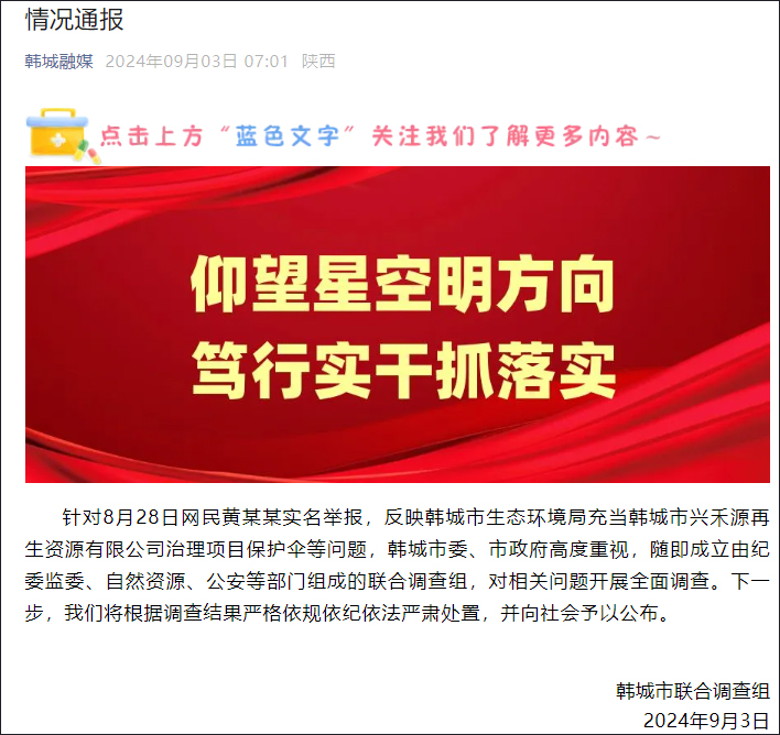 據陝西渭南韓城市融媒體中心微信公眾號“韓城融媒”消息,韓城市聯合調查組9月3日發佈情況通報稱,針對8月28日網民黃某某實名舉報,反映韓城市生態環境局充當韓城市興禾源再生資源有限公司治理項目保護傘等問題,韓城市委、市政府高度重視,隨即成立由紀委監委、自然資源、公安等部門組成的聯合調查組,對相關問題開展全面調查。下一步,將根據調查結果嚴格依規依紀依法嚴肅處置,並向社會予以公佈。