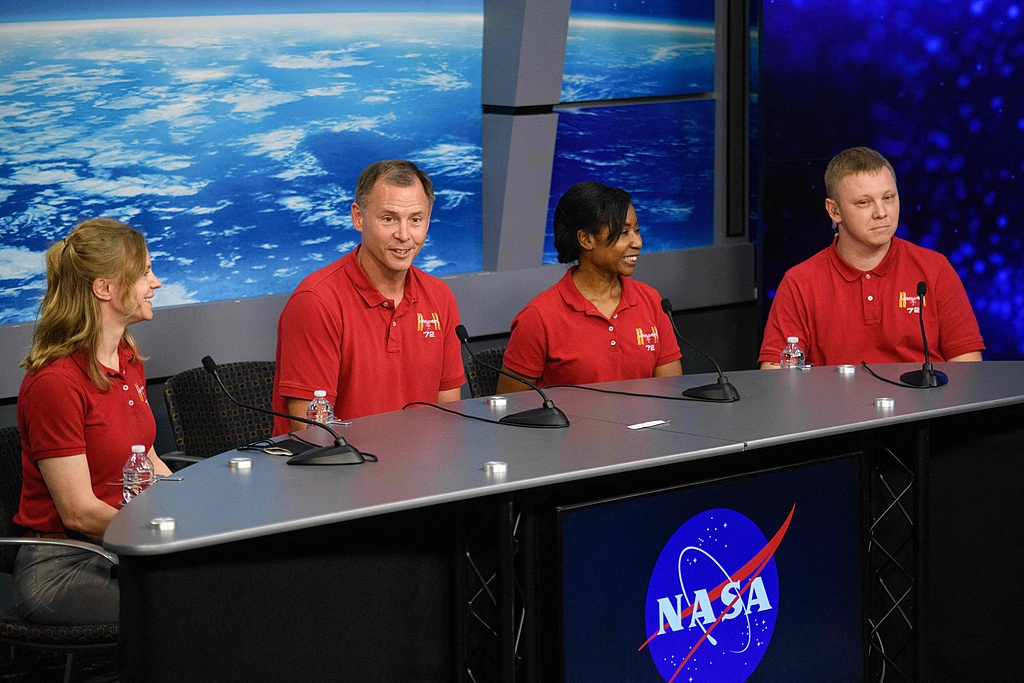 當地時間7月26日,美國宣佈“Crew-9”太空任務計劃,美國宇航員尼克·海格(左二)和俄羅斯宇航員亞歷山大·戈爾布諾夫(右一)出席記者會。視覺中國