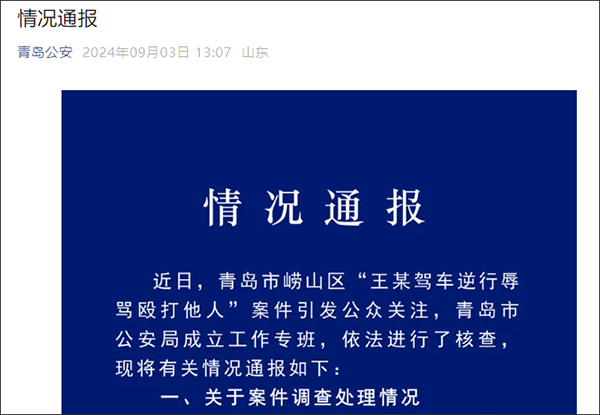 青島警方通報“王某駕車逆行辱罵毆打他人”案件核查情況