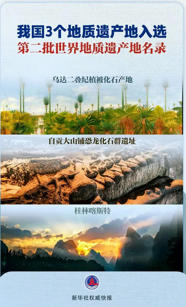 記者9月3日從中國科學院獲悉,第二批100個世界地質遺產地名錄日前公佈,我國有3個地質遺產地入選,分別為烏達二疊紀植被化石產地、自貢大山鋪恐龍化石羣遺址和桂林喀斯特。