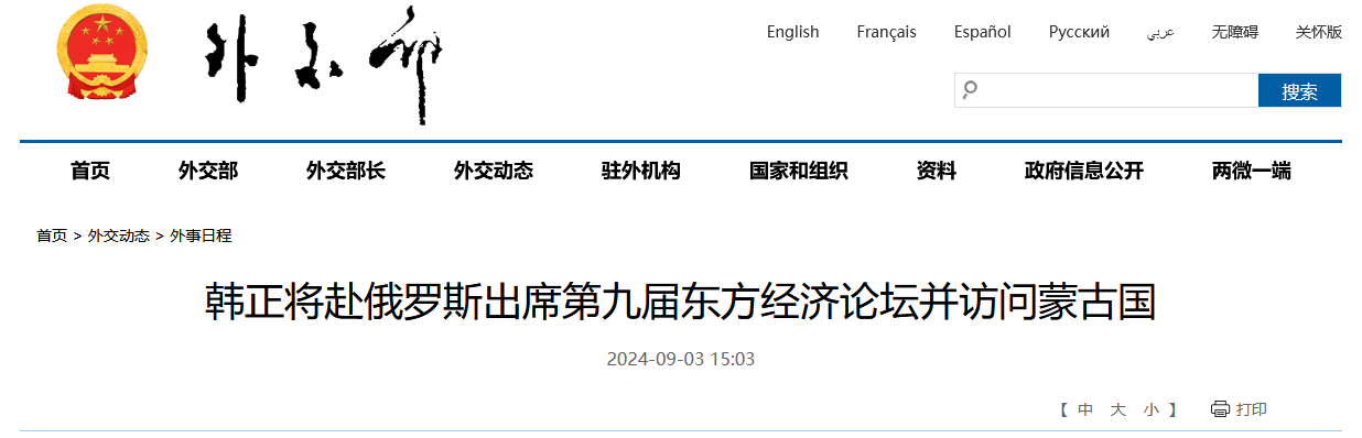 韓正將赴俄羅斯出席第九屆東方經濟論壇並訪問蒙古國 guancha 2024-09-03 外交部網站9月3日消息,外交部發言人毛寧宣佈: 應俄羅斯聯邦政府和蒙古國政府邀請,國家副主席韓正將於9月4日至8日赴俄羅斯符拉迪沃斯託克市出席第九屆東方經濟論壇,對蒙古國進行訪問。