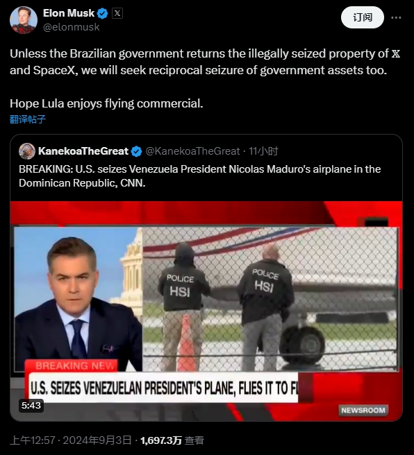 同日,馬斯克在X平台轉發了一則“美國扣押委內瑞拉總統馬杜羅的專機”的新聞,並寫道:“除非巴西政府歸還非法扣押的X平台和 SpaceX的財產,否則我們將尋求對等扣押(巴西)政府資產。希望盧拉享受商業飛行。”他沒有就此展開進一步説明。