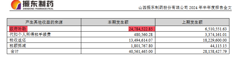 此外,報告期內的非經常性損益合計為6142.20萬元。這些非經常性損益主要來源於政府補助、理財收益以及資產處置等方面。其中,政府補助和理財收益是公司非經常性損益的重要組成部分,具體來看,今年上半年振東製藥收到政府補助247.84萬元。