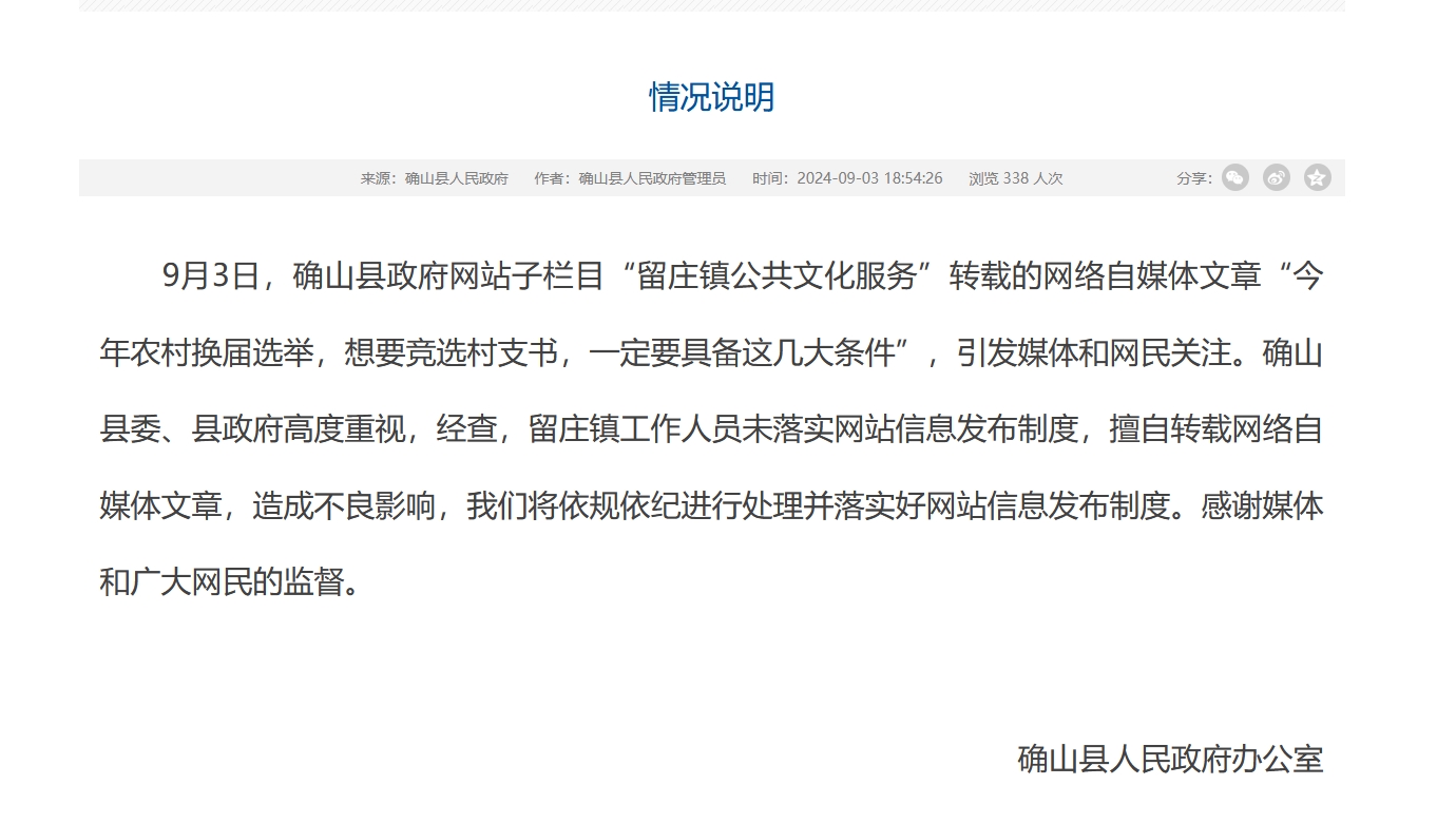 9月3日,確山縣政府網站子欄目“留莊鎮公共文化服務”轉載的網絡自媒體文章“今年農村換屆選舉,想要競選村支書,一定要具備這幾大條件”,引發媒體和網民關注。確山縣委、縣政府高度重視,經查,留莊鎮工作人員未落實網站信息發佈制度,擅自轉載網絡自媒體文章,造成不良影響,我們將依規依紀進行處理並落實好網站信息發佈制度。感謝媒體和廣大網民的監督。