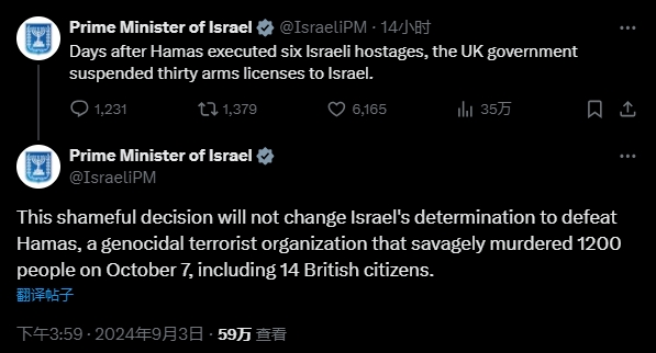 報道稱,當天,英國政府當天撤銷了總計350份對以武器出口許可證中的30份,暫停對以色列出售包括軍用飛機、直升機和無人機零部件在內的武器裝備。