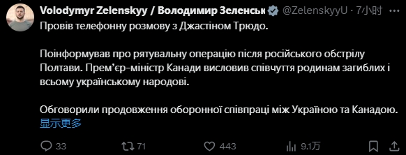 澤連斯基當天在社交媒體X平台發佈消息稱,他與特魯多通話,討論了俄烏衝突最新進展以及兩國間國防合作問題,並概述了烏方國防軍目前的需求,包括額外的防空系統和裝甲車。