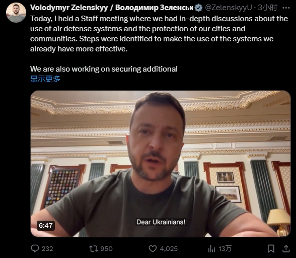 稍晚時候,澤連斯基發佈推文表示,他在當天召開的部長會議上再次深入討論了防空系統的使用問題。
