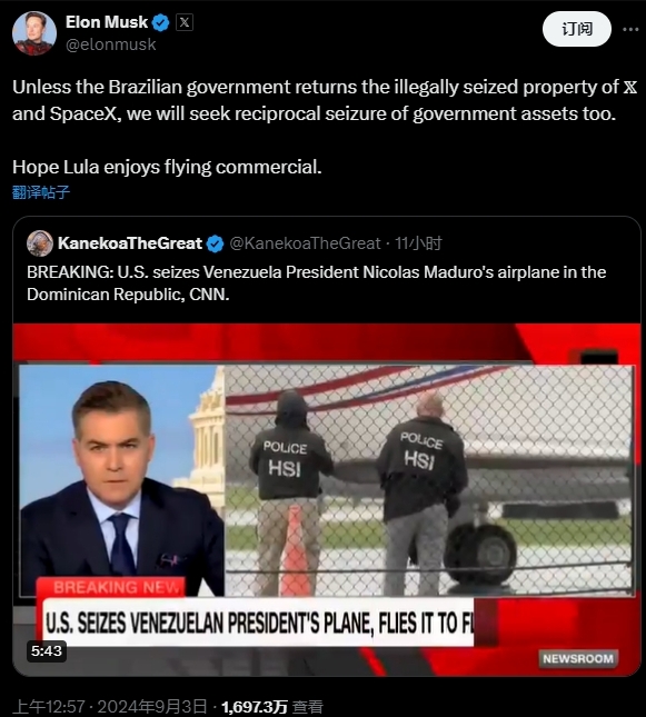 同日,馬斯克繼續“硬剛”,在X平台轉發了一則“美國扣押委內瑞拉總統馬杜羅的專機”的新聞,並寫道:“除非巴西政府歸還非法扣押的X平台和 SpaceX的財產,否則我們將尋求對等扣押(巴西)政府資產。希望盧拉享受商業飛行。”他沒有就此展開進一步説明。