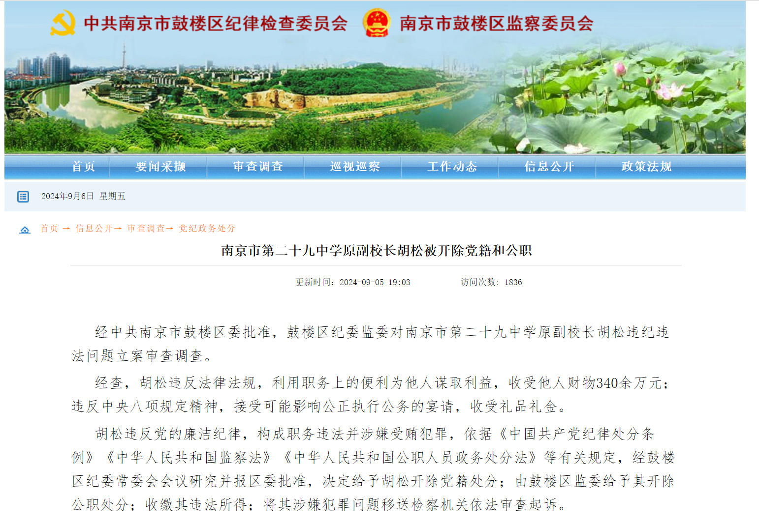 據南京市鼓樓區紀委監委網站5日消息,南京市第二十九中學原副校長鬍松被開除黨籍和公職。