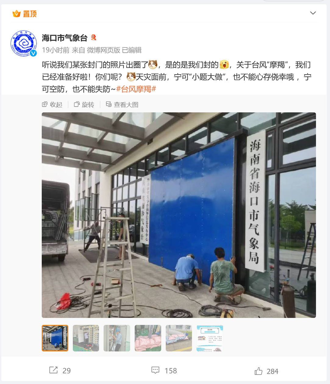 9月5日晚,海口市氣象台官方微博發佈消息證實,“聽説我們某張封門的照片出圈了,是的是我們封的。”
