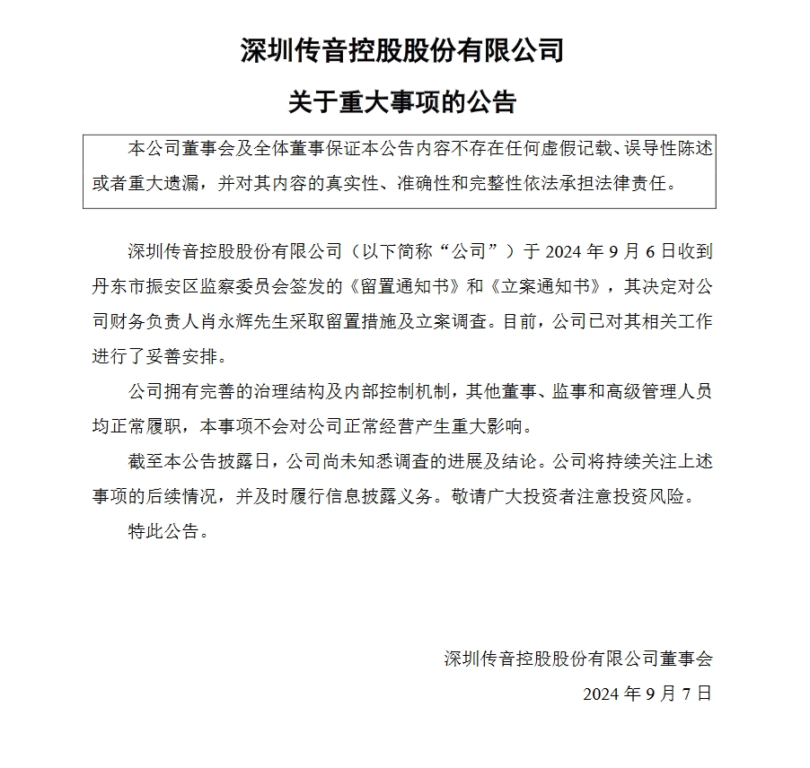 深圳傳音控股股份有限公司(以下簡稱“公司”)於2024年9月6日收到丹東市振安區監察委員會簽發的《留置通知書》和《立案通知書》,其決定對公司財務負責人肖永輝先生採取留置措施及立案調查。目前,公司已對其相關工作進行了妥善安排。
