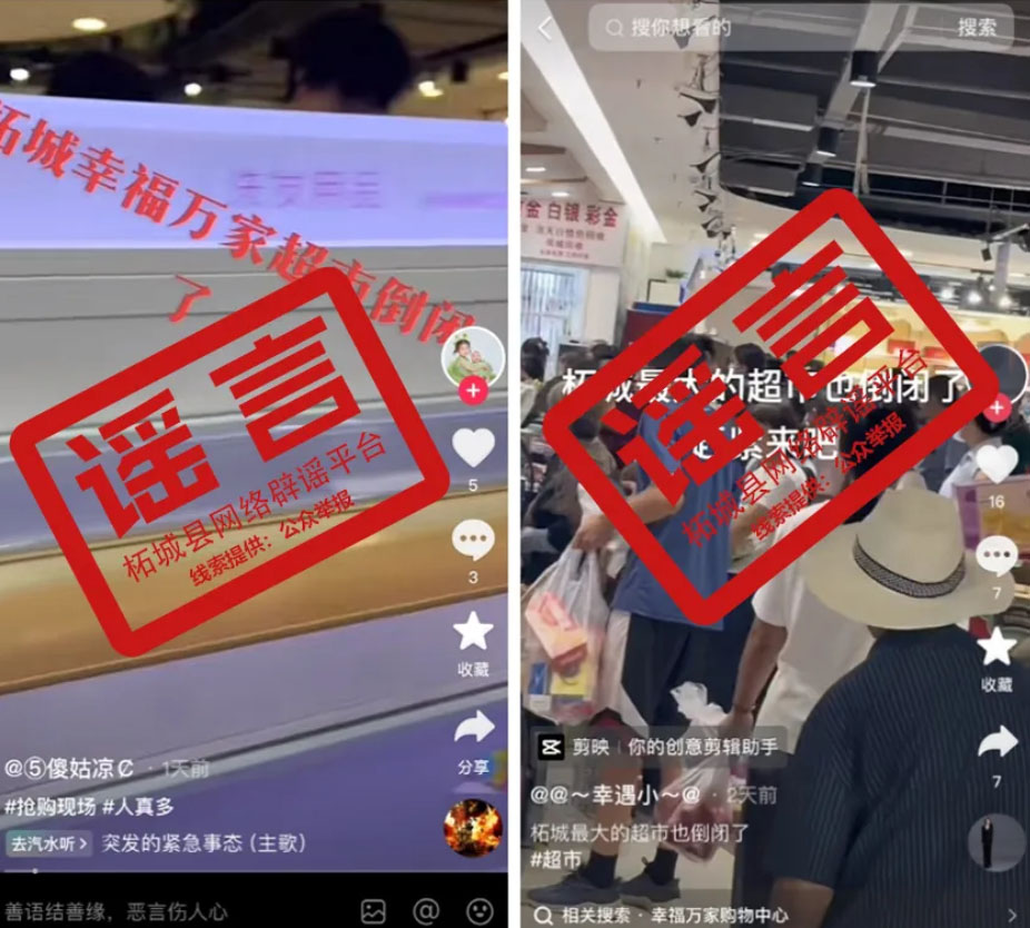 據微信公眾號“網信商丘”7日消息,近日,“⑤傻姑涼¢”“@~幸遇小~@”等網絡賬號在短視頻平台發佈關於“柘城幸福萬家超市倒閉了”等信息,在互聯網上迅速傳播,引發當地羣眾到超市搶購商品,造成不良影響。