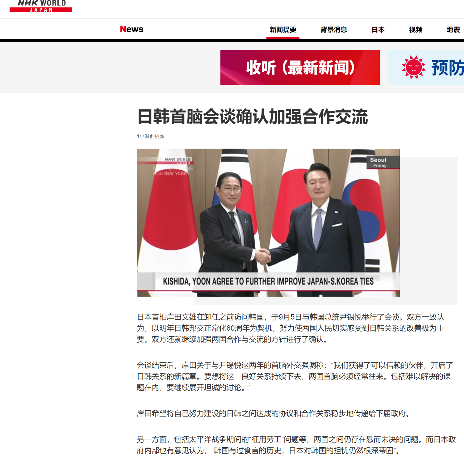 2024年9月6日,日本首相岸田文雄卸任前夕,最後一次以“穿梭外交”名義,公務訪問韓國,會見韓國總統尹錫悦。
