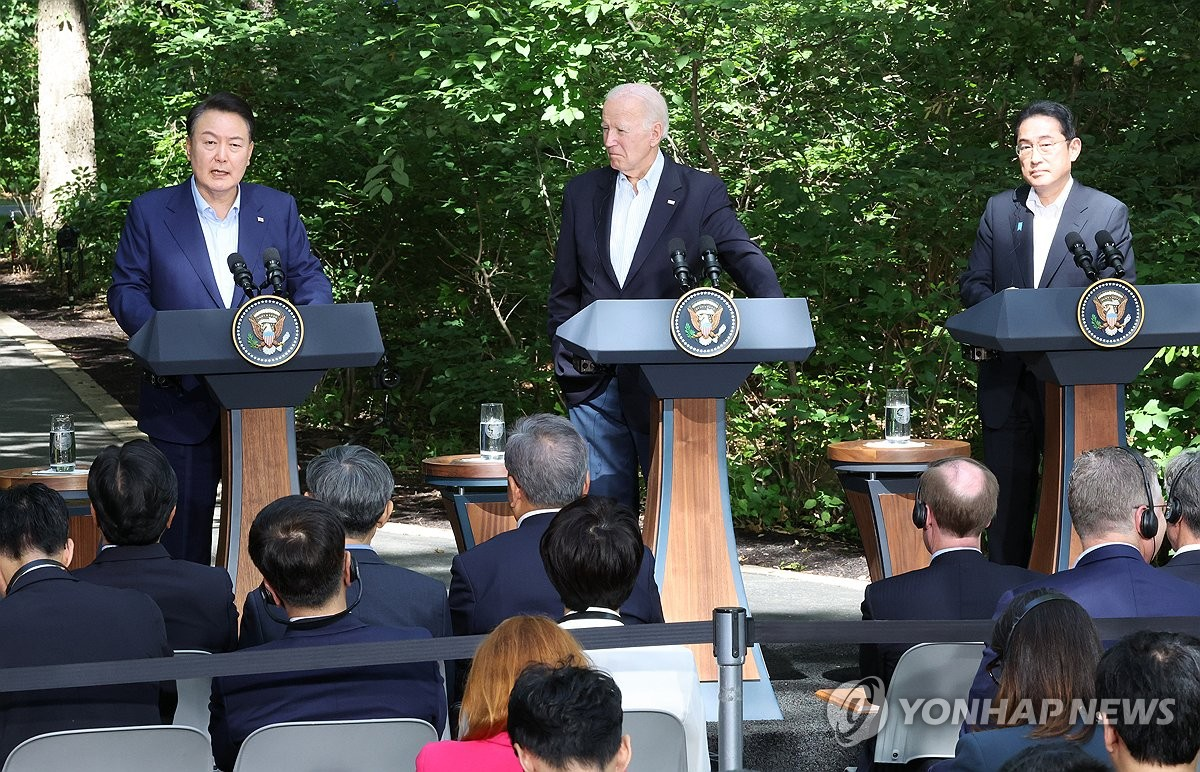 當地時間2023年8月18日,在美國戴維營,韓國總統尹錫悦、美國總統拜登、日本首相岸田文雄在首腦會談後聯合舉行記者會。韓聯社