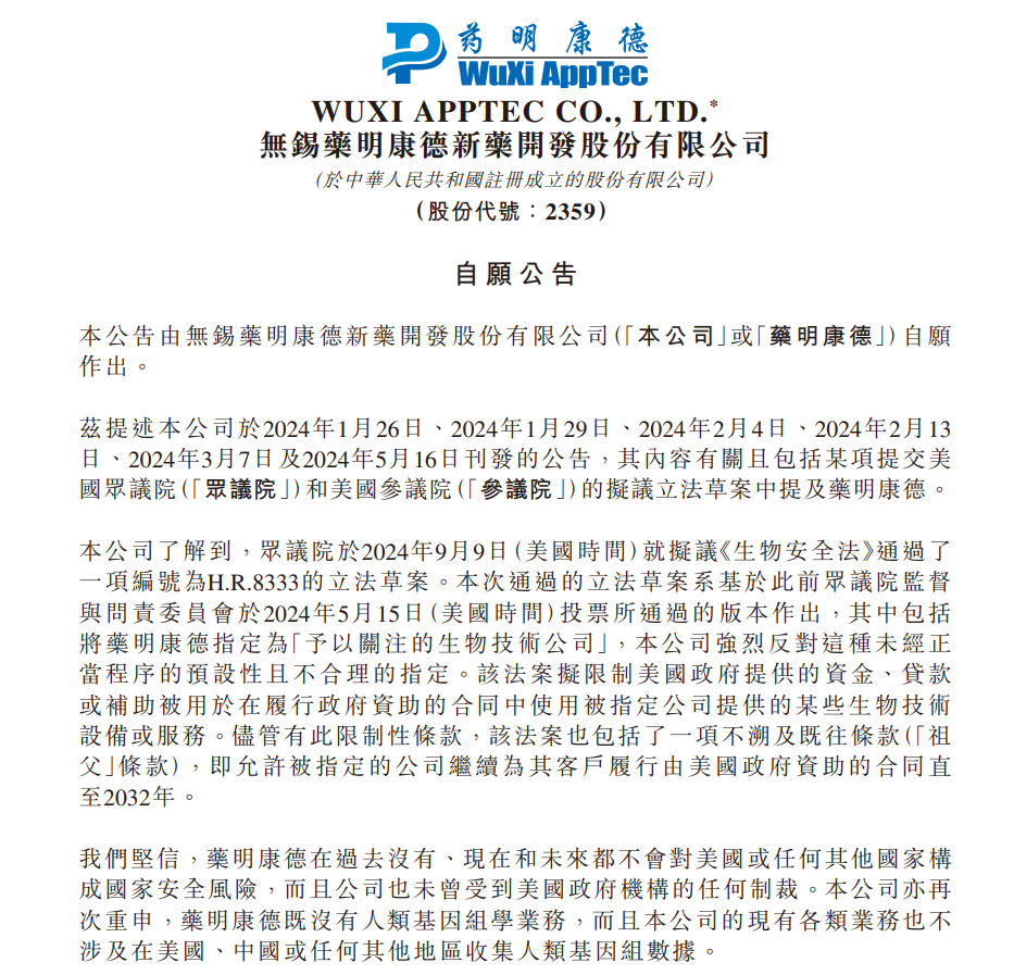 藥明康德在港交所公告:本公司瞭解到,美國眾議院於2024年9月9日(美國時間)就擬議《生物安全法》通過了一項編號為H.R.8333的立法草案。本次通過的立法草案系基於此前眾議院監督與問責委員會於2024年5月15日(美國時間)投票所通過的版本作出,其中包括將藥明康德指定為“予以關注的生物技術公司”,本公司強烈反對這種未經正當程序的預設性且不合理的指定。我們堅信,藥明康德在過去沒有、現在和未來都不會對美國或任何其他國家構成國家安全風險,而且公司也未曾受到美國政府機構的任何制裁。
