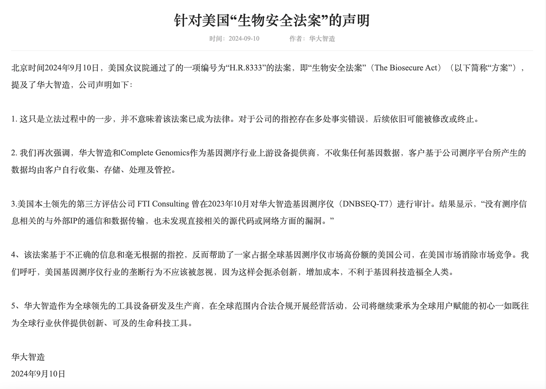 深圳華大智造科技股份有限公司發佈聲明,強調華大智造和Complete Genomics作為基因測序行業上游設備提供商,不收集任何基因數據,客户基於公司測序平台所產生的數據均由客户自行收集、存儲、處理及管控。聲明指出,法案“存在多處事實錯誤,後續依舊可能被修改或終止”。