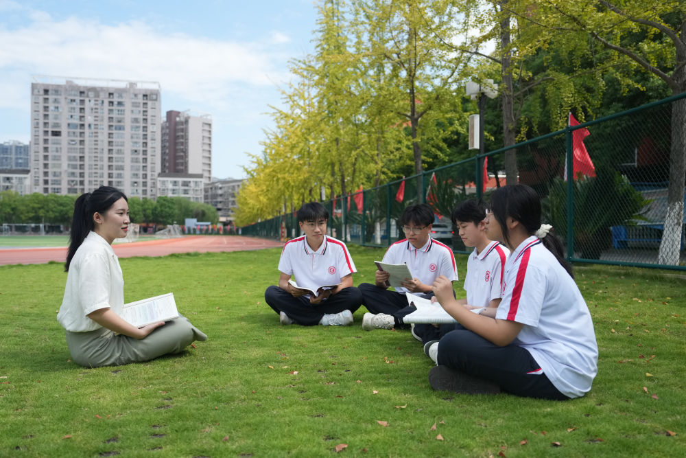 ↑龔佳穎(中)在課堂上檢查學生作業。