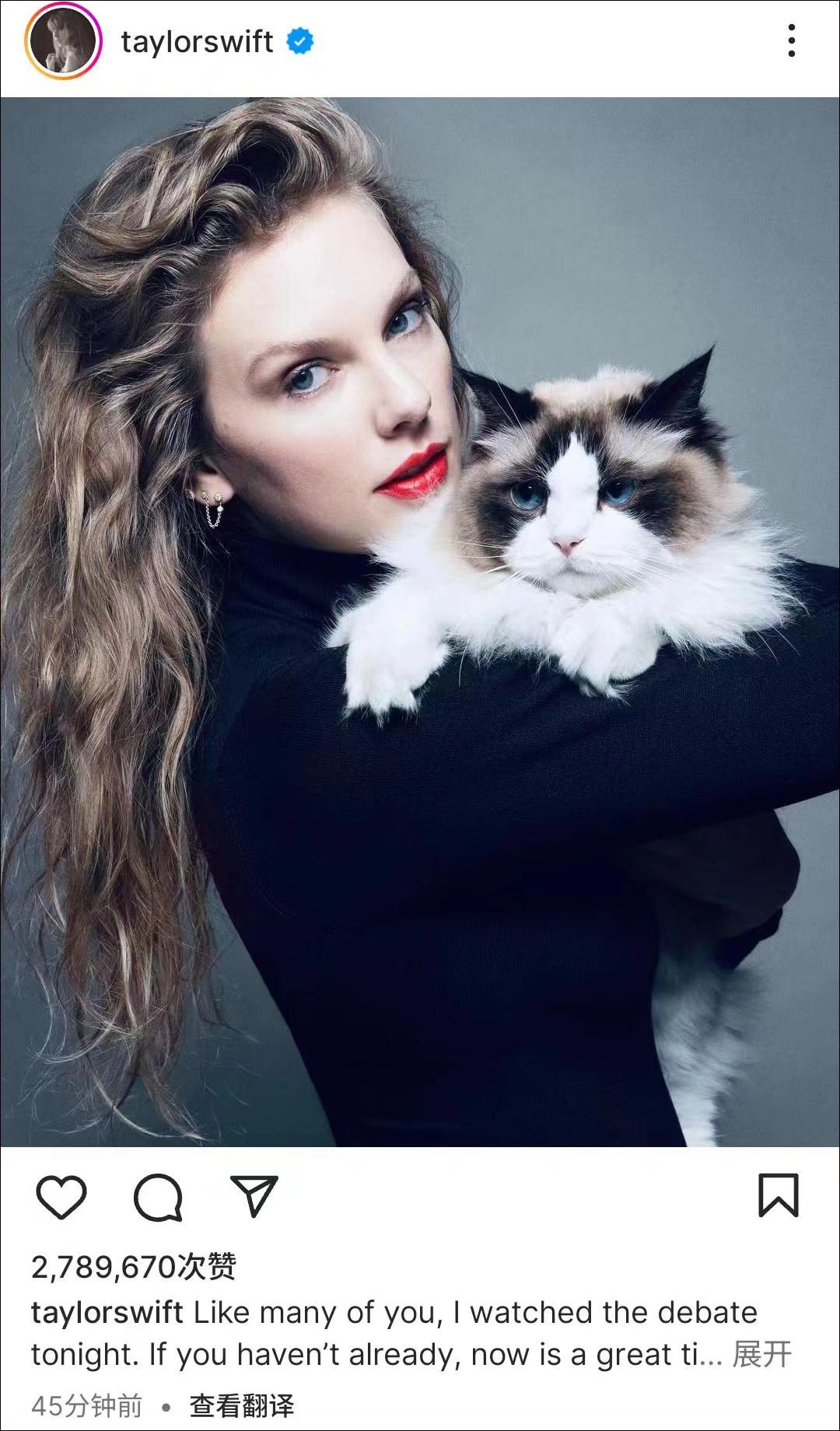 泰勒·斯威夫特在Instagram上擁有超2.8億粉絲,截至當地時間9月10日晚些時候,這條貼文在發佈兩小時後,已經在平台上獲得了430多萬個“贊”。