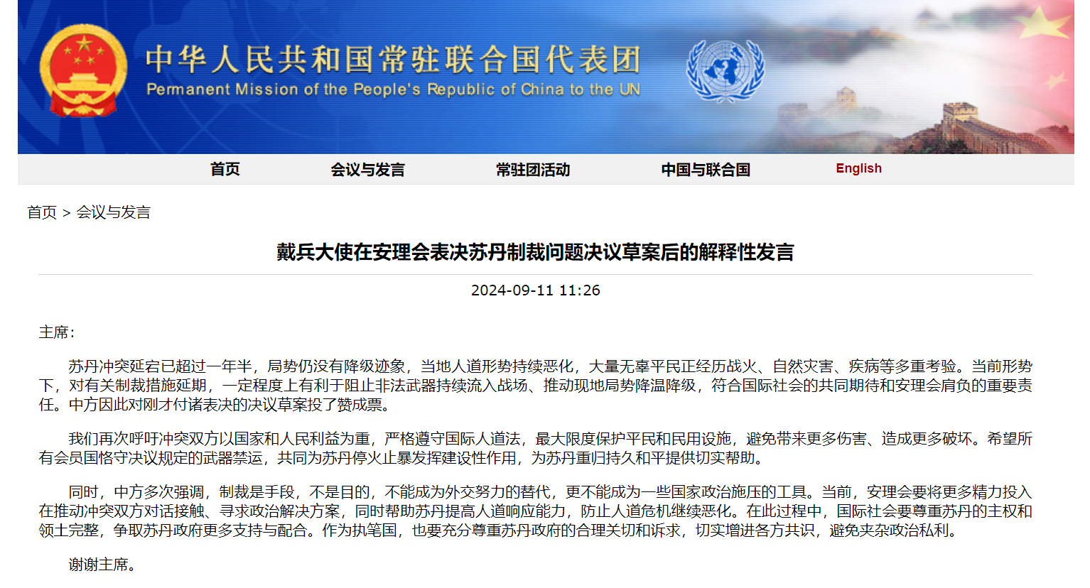 據中國常駐聯合國代表團網站消息,當地時間9月11日,戴兵大使在安理會表決蘇丹制裁問題決議草案後做解釋性發言,全文如下: