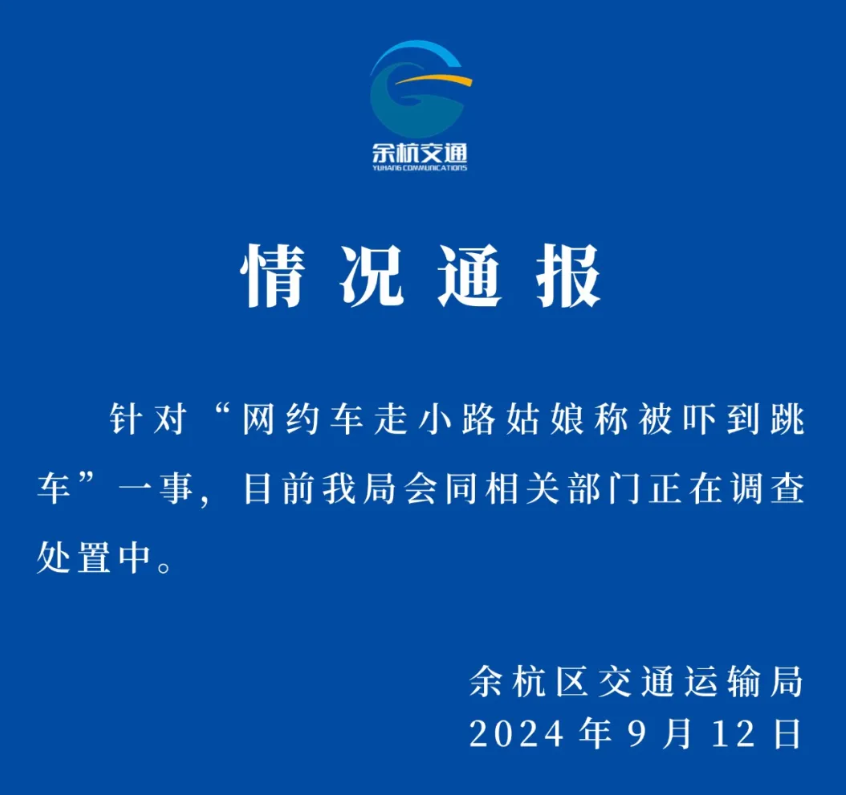 據微信公眾號“餘杭交通”消息,9月12日,杭州市餘杭區交通運輸局發佈情況通報稱,針對“網約車走小路姑娘稱被嚇到跳車”一事,目前該局會同相關部門正在調查處置中。