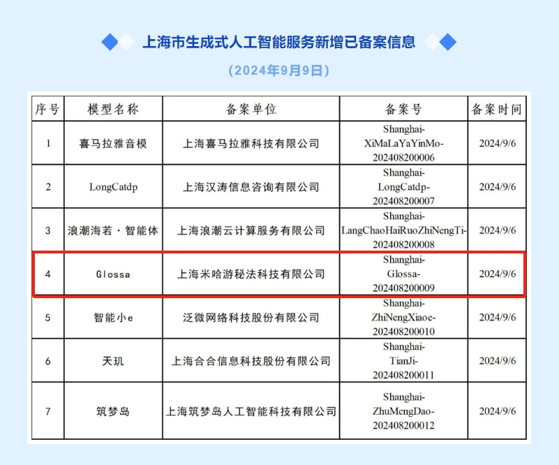 此次新增的7款完成備案的AI模型中,包含米哈遊旗下一款名為“Glossa”的模型。