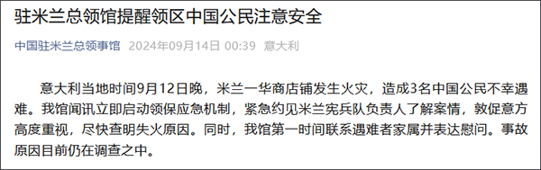 微信公眾號“中國駐米蘭總領事館”9月14日發佈消息,提醒領區中國公民注意安全。