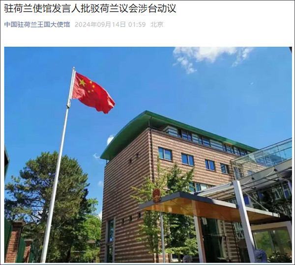 據微信公眾號“中國駐荷蘭王國大使館”9月14日消息,我駐荷蘭使館發言人批駁荷蘭議會涉台動議。
