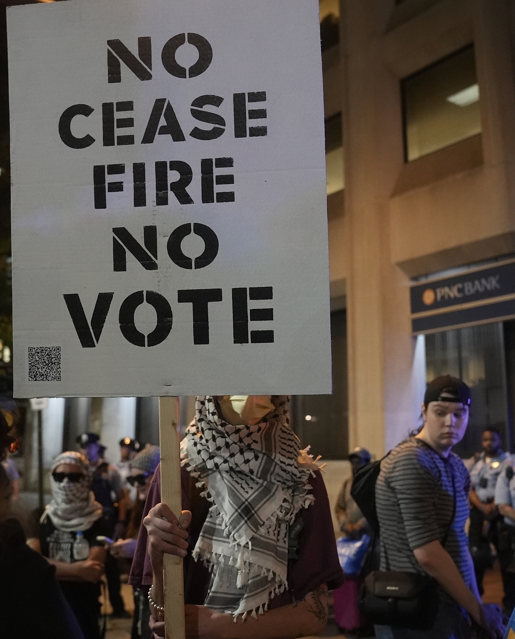 大選辯論期間,不少支持巴勒斯坦的親民主黨人士在辯論現場外抗議視覺中國