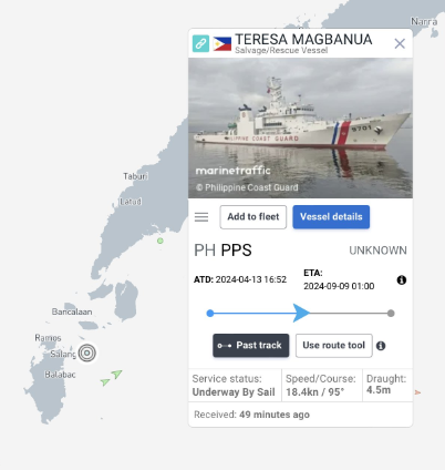 舒加特在9月14日的推文中寫道,根據AIS數據,菲律賓海警船“特雷莎·馬格巴努亞”號似乎已經離開仙賓礁,正在從巴拉望島以南航行,似乎正以18節的速度向東行駛。
