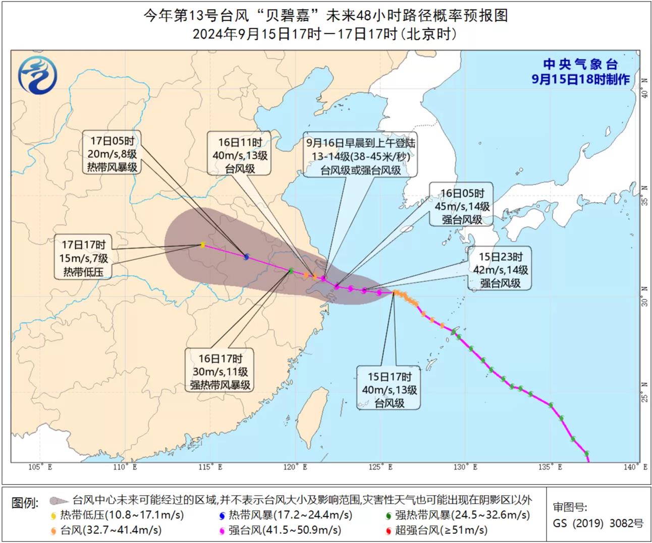 大風預報:9月15日20時至16日20時,黃海南部、東海大部、浙江北部、上海、江蘇南部、安徽東部將有6~8級、陣風9-10級的大風,其中東海北部、上海東部及其沿海、江蘇東南部及其沿海、浙江東北部及其沿海、杭州灣、長江口區、舟山羣島附近海域將有9~11級、陣風12~13級的大風,“貝碧嘉”中心經過的附近海域或地區風力可達12~14級、陣風15~16級。