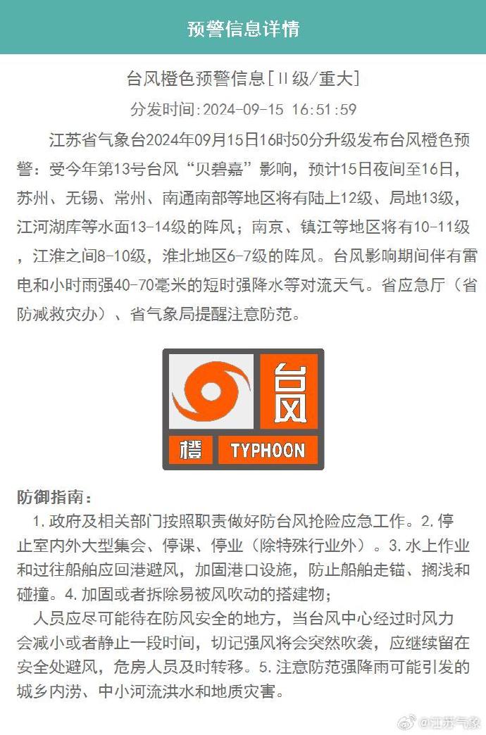 江蘇省氣象台2024年09月15日16時50分升級發佈颱風橙色預警:受今年第13號颱風“貝碧嘉”影響,預計15日夜間至16日,蘇州、無錫、常州、南通南部等地區將有陸上12級、局地13級,江河湖庫等水面13-14級的陣風;南京、鎮江等地區將有10-11級,江淮之間8-10級,淮北地區6-7級的陣風。颱風影響期間伴有雷電和小時雨強40-70毫米的短時強降水等對流天氣。省應急廳(省防減救災辦)、省氣象局提醒注意防範。