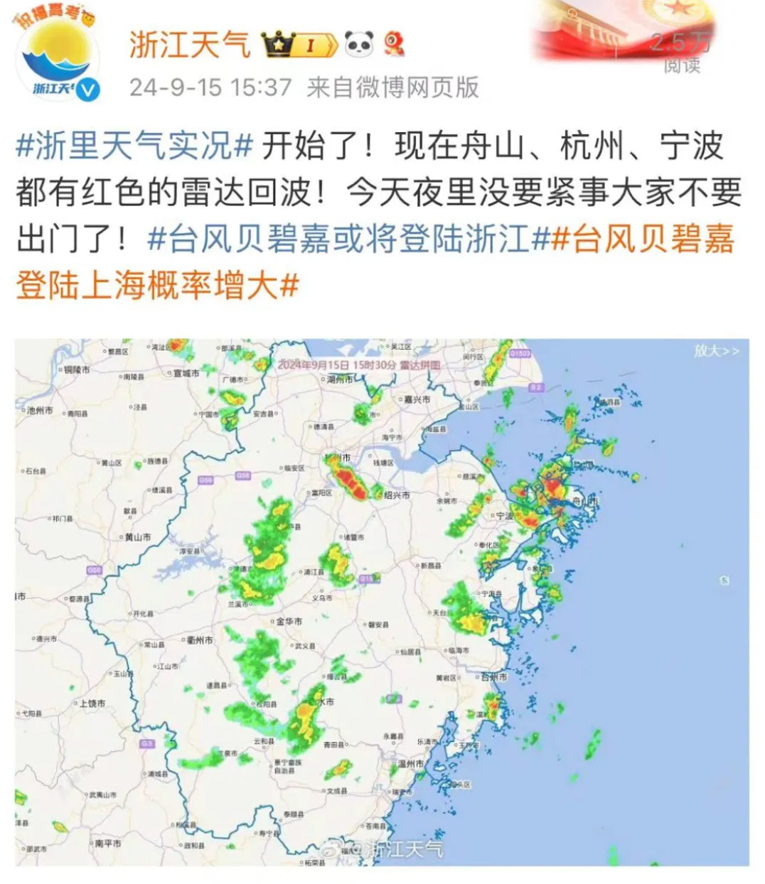 @浙江天氣 發文稱:開始了!現在舟山、杭州、寧波都有紅色的雷達回波!今天夜裏沒要緊事大家不要出門了!