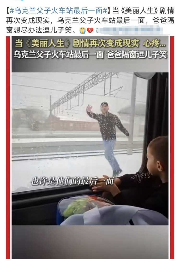 近日,一則“烏克蘭父子火車站最後一面”的視頻流傳於中文社交網絡。視頻中,在緩緩啓動的火車車窗外,一名男子設法逗車內的孩子笑,一旁則有女性哭泣的聲音。15日,話題#烏克蘭父子火車站最後一面#登上微博熱搜第一。