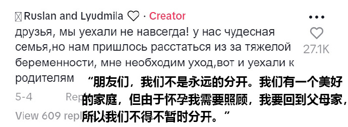 經觀察者網查證,該視頻由博主ruslan_and_lyudmila發佈於2024年4月28日。5月4日,該博主在評論區補充道:“朋友們,我們不是永遠的分開。我們有一個美好的家庭,但由於懷孕我需要照顧,我要回到父母家,所以我們不得不暫時分開。”