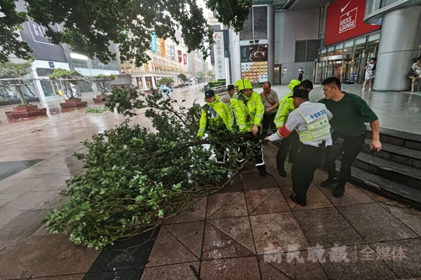 南京路步行街上,民警和安保人員合力清理被大風吹落的樹枝 新民晚報記者 劉歆/攝