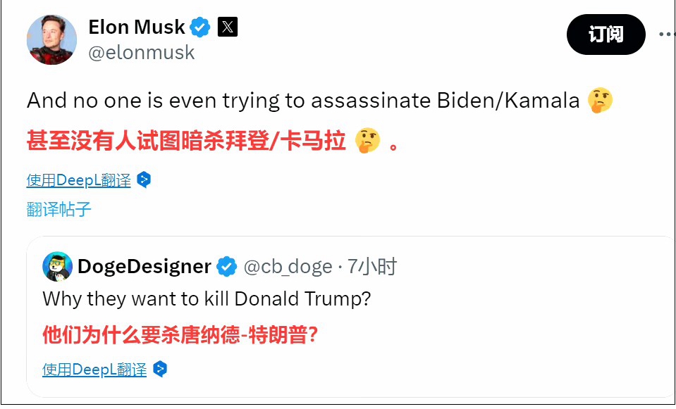 在事件發生後,埃隆·馬斯克的一則社交媒體帖子迅速引發了爭議。他質問道:“甚至沒有人試圖暗殺拜登或哈里斯”,從民主黨,左翼進步主義,以及廣義的反特朗普的政治力量來看,此言無疑是煽動性言論的典型例子,也反映了某種認知錯亂。