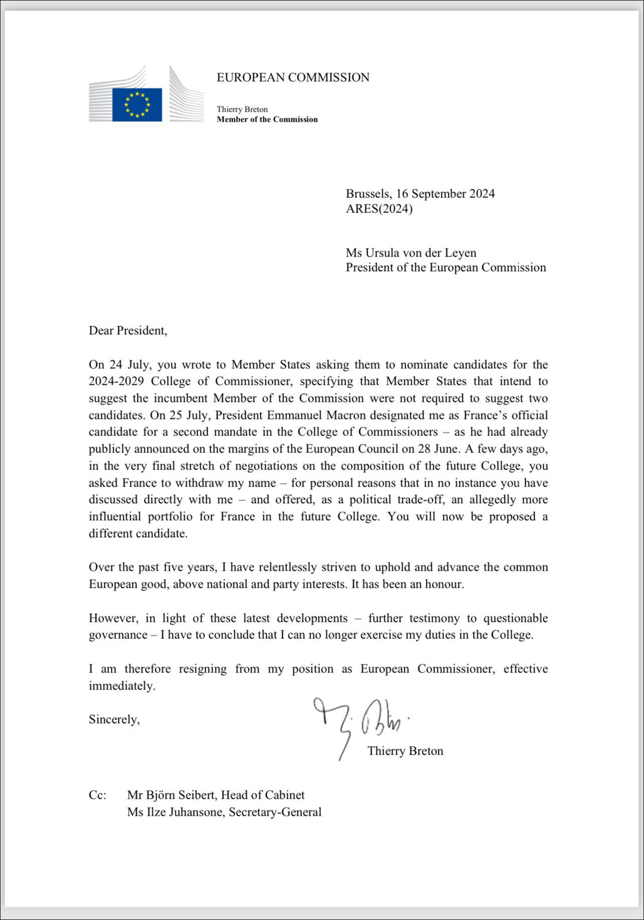 佈雷東當天在社交媒體X(原推特)上公佈了一封他給馮德萊恩的信件。信中稱,幾天前,在新一屆歐委會組成談判的最後階段,馮德萊恩“出於個人原因”向法國施壓,要求法國撤回佈雷東的候選人資格;作為“政治交換”,她許諾向法國提供更有影響力的委員會職位。