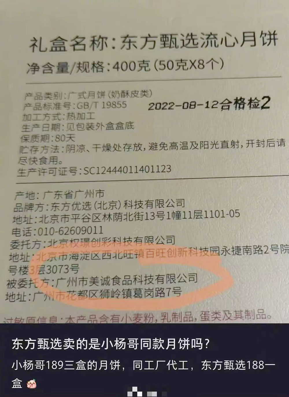 近日,“瘋狂小楊哥”及“三隻羊”旗下主播推銷的美誠月餅陷入虛假宣傳風波。有網友曝料稱,廣州市美誠食品科技有限公司曾為東方甄選代工月餅。