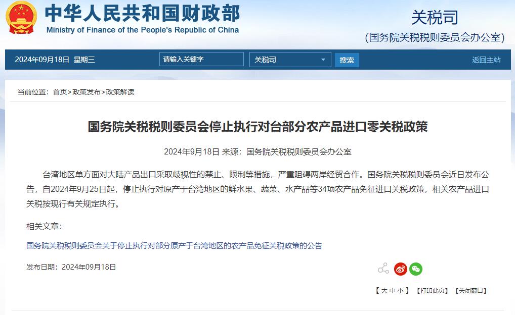 據財政部網站18日消息:台灣地區單方面對大陸產品出口採取歧視性的禁止、限制等措施,嚴重阻礙兩岸經貿合作。國務院關税税則委員會近日發佈公告,自2024年9月25日起,停止執行對原產於台灣地區的鮮水果、蔬菜、水產品等34項農產品免徵進口關税政策,相關農產品進口關税按現行有關規定執行。