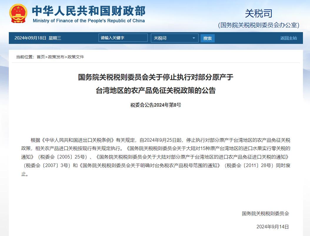 根據《中華人民共和國進出口關税條例》有關規定,自2024年9月25日起,停止執行對部分原產於台灣地區的農產品免徵關税政策,相關農產品進口關税按現行有關規定執行。