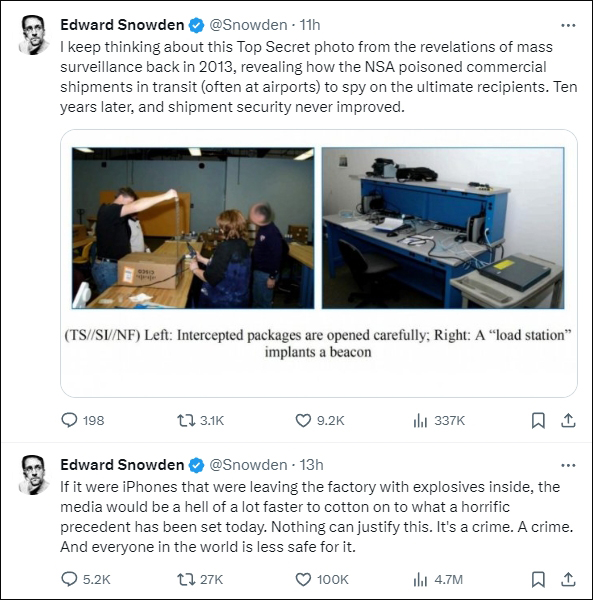 “稜鏡門”曝光者、素有美國“吹哨人”之稱的斯諾登18日X平台上評論説,爆炸事件“讓世界上每個人都變得更不安全了”。他説,試想“如果有一天出廠的iPhone內部塞滿爆炸物,媒體就會更快明白今天發生的是一個多麼恐怖的先例”。