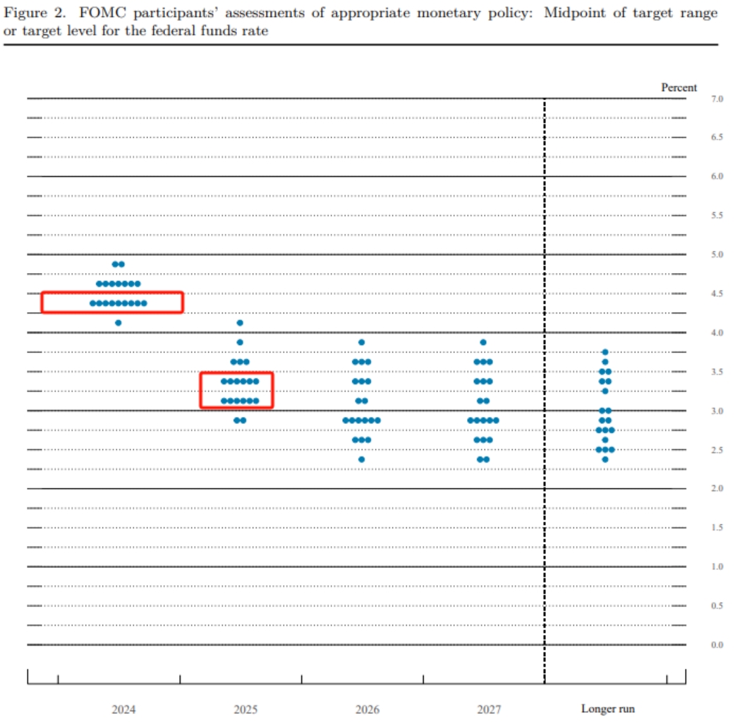 此外,根據美聯儲的預測,今年年底美國聯邦基金利率將達到4.4%,即4.25%至4.5%的目標區間,到2025年將降至3.4%,到2026年預計將降至2.9%。
