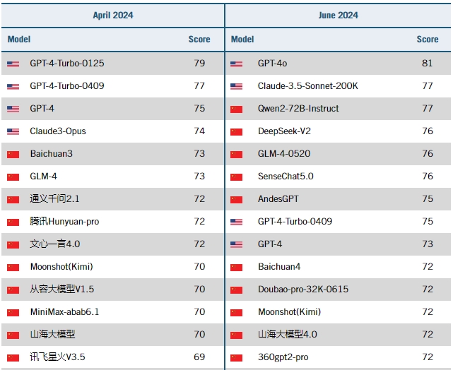 中文大模型綜合性評測基準(SuperCLUE)的中美大語言模型得分。報告截圖