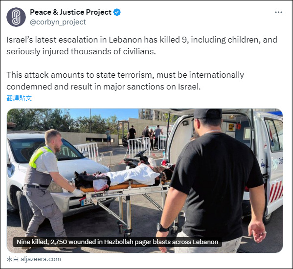 “中東正在發生危險的戰爭升級,而這場戰爭的起因是以色列。內塔尼亞胡不滿足於對加沙地帶的種族滅絕性襲擊,他決心在整個地區發動戰爭。”英國政治活動家、停止戰爭聯盟林賽·赫爾曼(Lindsey German)説,她同樣將黎巴嫩近期的爆炸事件稱為“無差別的國家恐怖主義行為”。