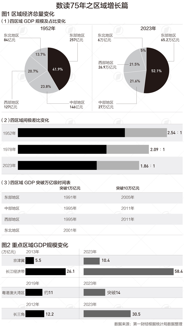 75年來,區域經濟經歷三個發展階段後,經濟總量不斷增加,相對差距呈現逐步縮小態勢。