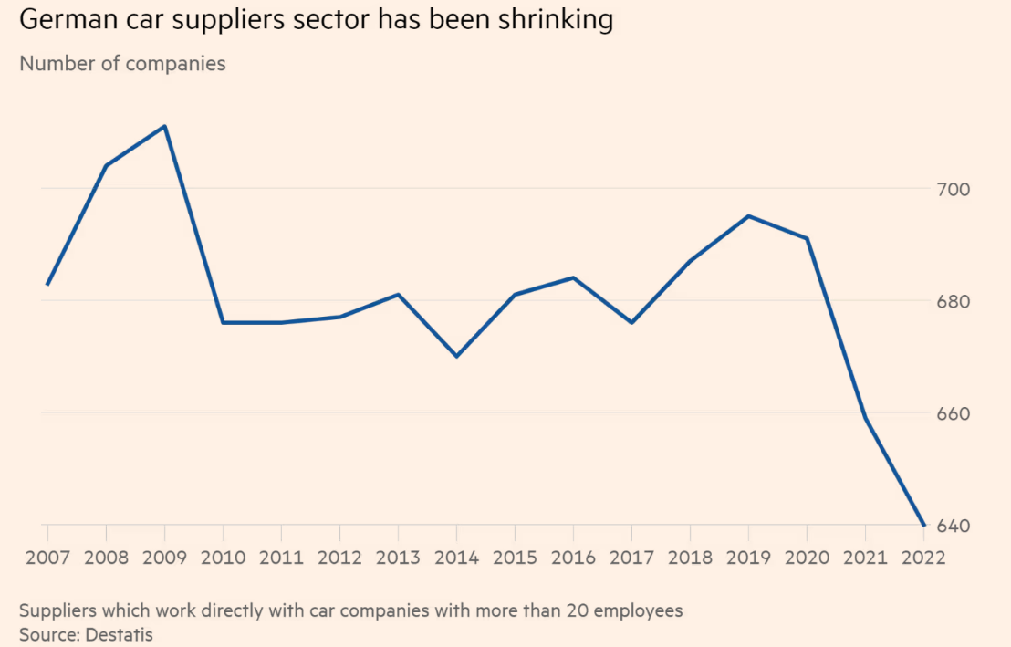 在最新的官方統計數據中,在截至2023年的3年裏,僅德國擁有20名以上員工的一級供應商的數量就從不到700家降至約615家,同期失業人數超過3萬人。